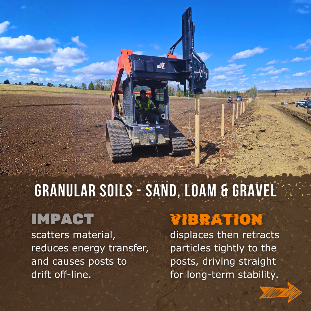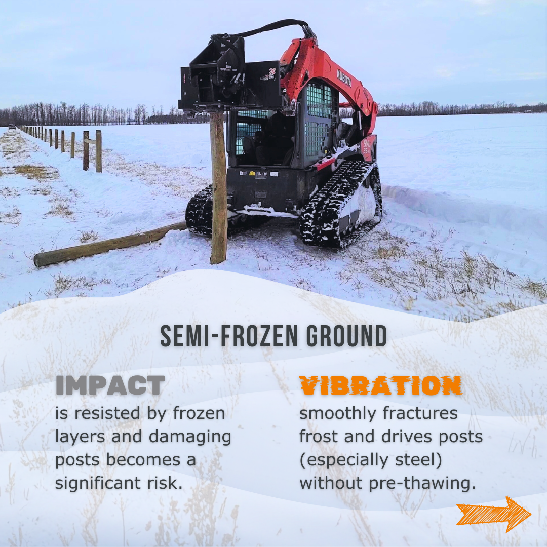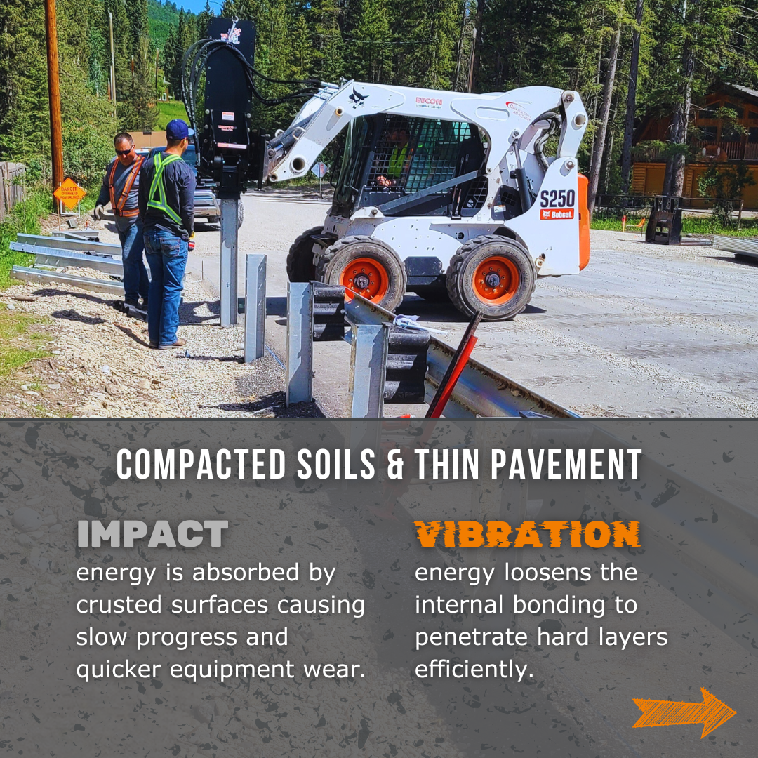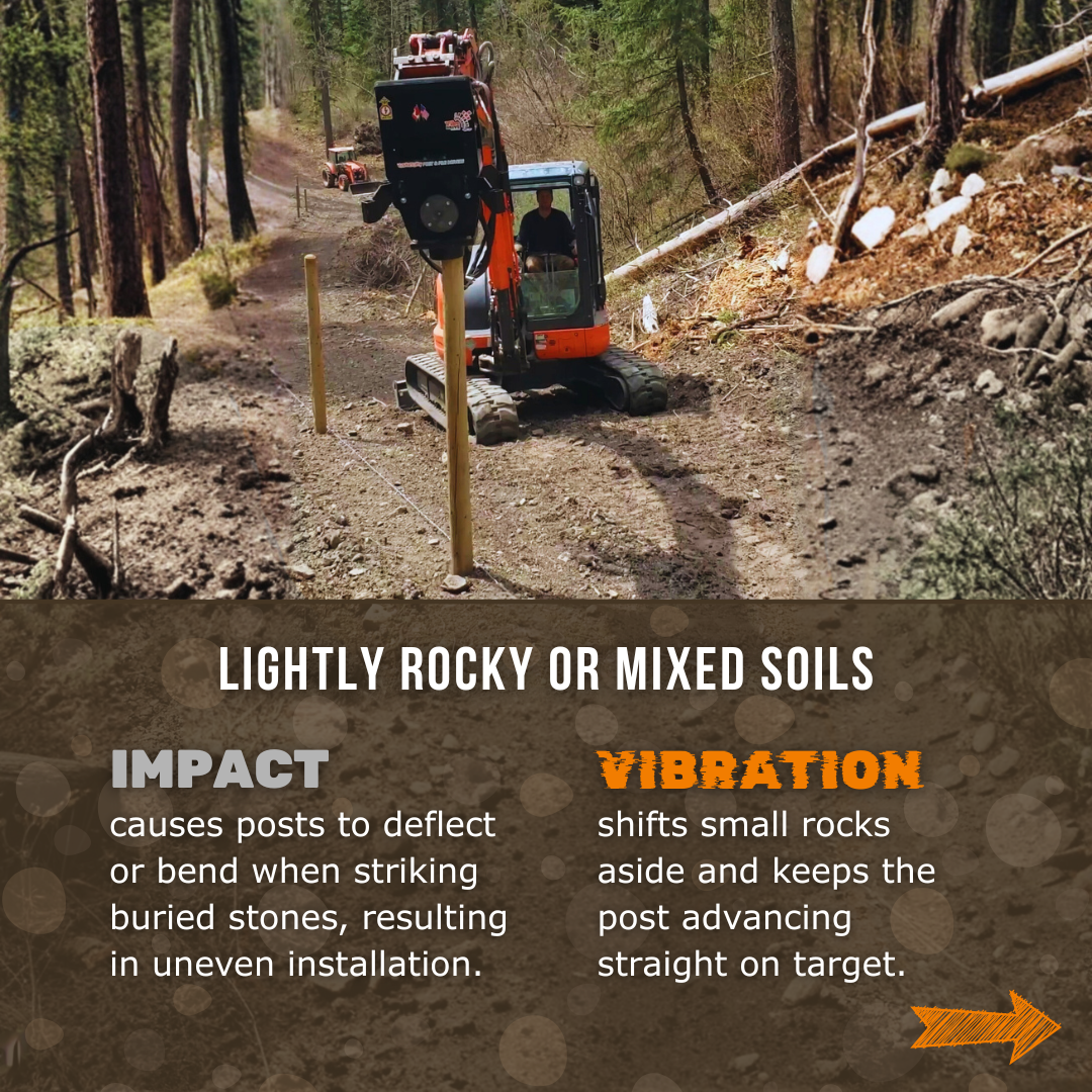 From easing through gravel, silt, and clay—to powering through rocky mixed soils, compacted ground, and thin pavement—you need a post driver that is built to perform. Even semi-frozen ground shouldn't slow you down.
